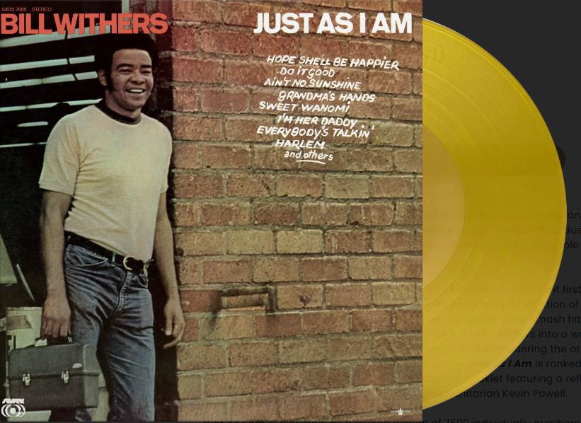Bill Withers was a modest, gentle, and yet towering musical figure responsible for some of the most important, universally known soul hits ever written. It’s no wonder that “Just the Two of Us” and “Ain’t No Sunshine” won him Grammy awards and undoubtedly played a huge role in getting him inducted into both the Songwriters and Rock and Roll Hall of Fame.Just As I Am is Withers' debut album and is by all measures a brilliant first outing. The record features twelve tunes of which most are Bill's own compositions, each song a reflection of his unique introspective, folky take on soul music. By far the most famous song on the album is the smash hit "Ain't No Sunshine", originally released as a B-side to the tune "Harlem" in 1971. It turned Withers into a worldwide soul icon, so much so that the song won him a Grammy for Best R&B Song in 1972. Considering the other single on the album is "Grandma's Hands", it's not hard to understand why Just As I Am is ranked #304 on Rolling Stone’s list of 500 Greatest Albums of All Time. This edition includes a booklet featuring a reflective essay on Bill Withers written by Grammy-nominated poet, journalist and humanitarian Kevin Powell.Just As I Am is available as a limited edition of 7500 individually numbered copies on yellow vinyl.